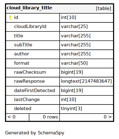 | cloudLibraryId | Must be unique | Asc | cloudLibraryId |