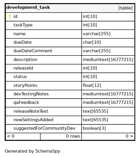 | Column | Type | Size | Nulls | Auto | Default | Children | Parents | Comments |