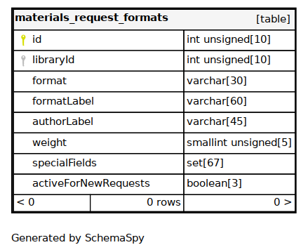 | Column | Type | Size | Nulls | Auto | Default | Children | Parents | Comments | |||