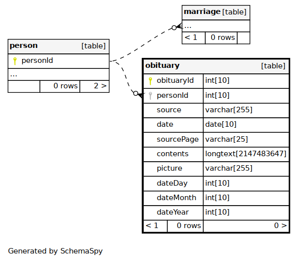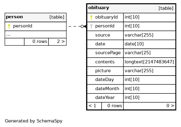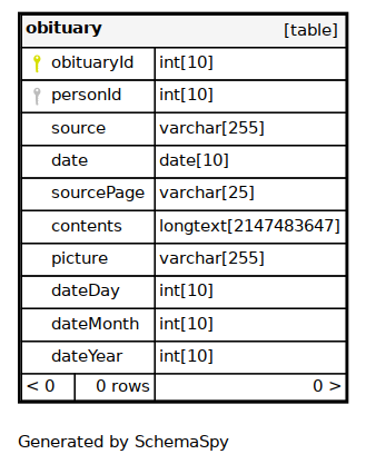 | PRIMARY | Primary key | Asc | obituaryId |