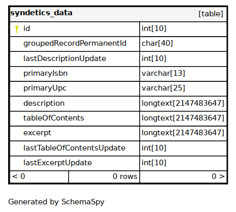 | Column | Type | Size | Nulls | Auto | Default | Children | Parents | Comments |