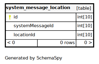 | systemMessageLocation | Must be unique | Asc/Asc | systemMessageId + locationId |