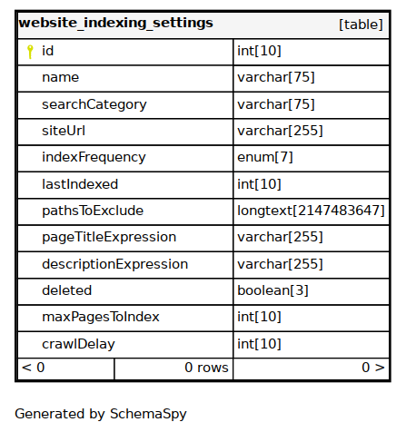 | Column | Type | Size | Nulls | Auto | Default | Children | Parents | Comments |